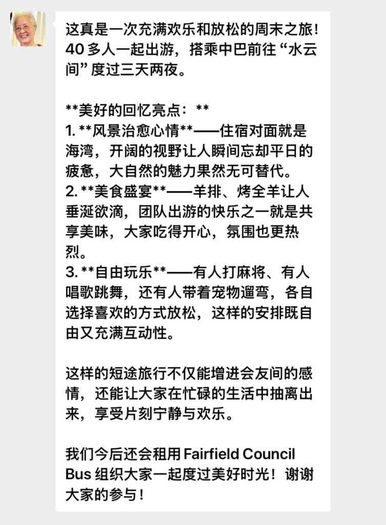 一种新颖.时尚.深受广大老年群体喜爱的户外休闲游活动在葛会长.窦会长的筹划下.租了二部中巴.领着40多位会员于5月16日~18日利用假期组织前往"水云间渡假村"休闲度假.为中老年朋友提供健康舒适的生活体验,面对中老年朋友.在不断提升中老年人健康生活质量方面."联友会""友谊会"发挥着越来越突出作用……