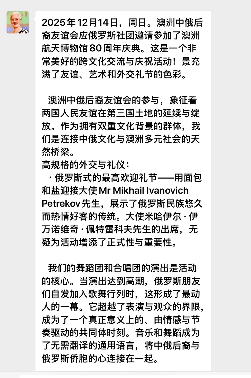 12月14號《中俄後裔友誼會》成員.受邀參加了澳洲太空博物館的慶典活動.這是一次成功的文化展現與情感凝聚.