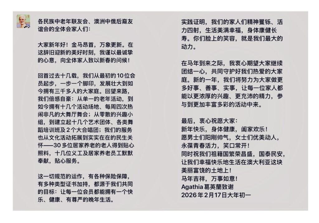 2026年2月澳洲雪梨各地都舉辦了多采多姿的慶祝中國春節活動. 2月17日雪梨歌劇院貝殼屋頂亮起了紅色的喜慶燈光.農曆春節.葛會長向全體家人致以新春的問候!